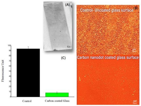 The coatings made from dip-coating BRS-CNDs on glass slides were exposed to Staphylococcus aureus cultures, and the anti-biofilm ability of the coatings was evaluated. Figure 7A shows the carbon coating on the glass slide. The control surface is the uncoated glass surface. As observed from Figure 7B, the epifluorescence imaging of the bacterial culture-exposed surfaces confirmed the antibiofilm ability of the BRS-CNDs coatings. The biofilm was quantified using ImageJ analysis, and these results also confirmed significant inhibition of biofilm formation on the BRS-CNDs-coated surfaces compared to the control (Figure 7C).