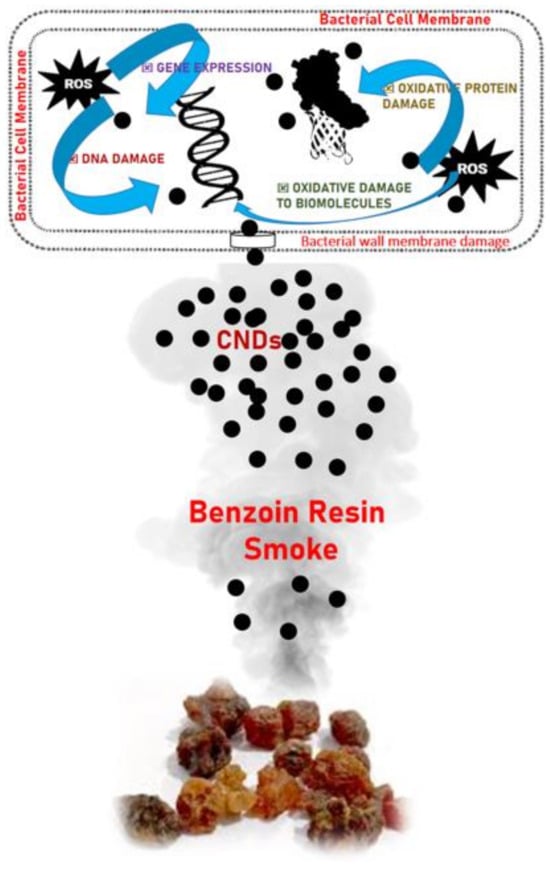 The results of the investigation showed how effective the BRS-CNDs were against coliform bacteria, especially against E. faecalis. The results further demonstrated the successful inhibition of oral bacteria by BRS-CNDs. Strong antibiofilm activity was also shown by the carbon coatings that were made from the BRS-CNDs. These findings support the anti-bactericidal properties of the benzoin resin smoke extracted carbon nanodots. These findings suggest that carbon nanoparticles derived from benzoin smoke may find application as potent antimicrobials. The antibacterial properties of medicinal smoke have been documented by earlier writers [,,]. Airborne microbes were reported to be significantly decreased on exposure to medicinal smoke. Chun et al. [] have documented the antimicrobial properties of CNDs extracted from turmeric smoke []. To pinpoint the exact mechanisms by which these CNDs function as antibacterial agents, more investigation is required. Nonetheless, it is reported that the mechanism of antibacterial activity of CNDs is usually via the rupturing of bacterial cell membranes, with eventual interaction with the cellular organelles and metabolic activity through reactive oxygen species (ROS) production. Figure 8 gives the speculated scheme showing the plausible mechanism behind the antibacterial activity of BRS-CNDs based on published reports [].