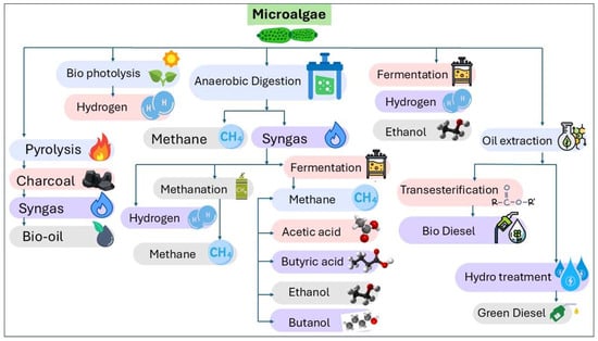 One of the key advantages of microalgae is its ability to grow in wastewater year-round in open ponds or photobioreactors and higher carbon sequestration compared to terrestrial plants. According to literature, 1 kg of algae can fix 1.8 kg of carbon dioxide [7]. Furthermore, microalgae can produce 10–30 times more biodiesel per hectare per year than terrestrial crops such as jatropha or soybean [8,9,10]. There are numerous industrial uses for microalgae. Certain microalgae, such as chlorella and spirulina, are high in protein and are used as dietary supplements [11]. On the other hand, microalgae Chlorella Dunaliella, Nannochloropsis, and Isochrysis can be utilized to produce a range of biofuels, including jet fuel, biodiesel, bioethanol, biogas, and biohydrogen depending upon biochemical composition [12,13,14,15] (Figure 1). High lipid content (between 20% and 80%), their ability to survive year-round even in wastewater, their high biomass productivity (doubling times of up to 24 h), and higher photosynthetic efficiency are some characteristics that make microalgae well-suited feedstock for biodiesel production [16,17,18,19]. Despite these advantages, several experiments aimed at commercializing microalgae-based biodiesel face significant challenges, primarily the high cultivation, harvesting, and lipid extraction costs [20]. Another significant challenge in microalgae biodiesel production is scaling up to meet market demands. The use of fresh water and nutrient availability during cultivation are some sustainability concerns. Hence, it is essential to address these challenges to enhance the sustainability and economic viability of microalgae biodiesel. Microalgae-derived biodiesel has a bright future ahead of it despite these obstacles. The full potential of microalgae biodiesel may be achieved using sustainable practices such as improved cultivation systems, genetic engineering, and integration with industrial waste streams [21].