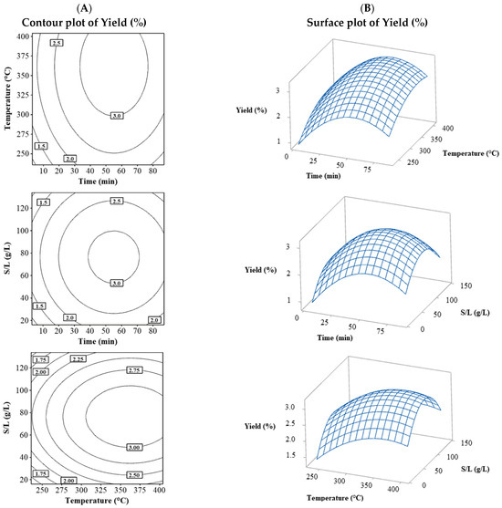 Contour (A) and surface (B) plots for the Yield (%) combining the process variables (temperature, time, and S/L).