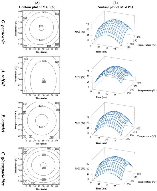 There was significant variation in % MGI, influenced more by extraction conditions than by the plant pathogen, with similar ranges across species but noticeable differences within the same range. Figure 2 shows the contour plots (Figure 2A) and surface plots (Figure 2B) of time vs. temperature for the four plant pathogens. The contour and surface plots resulting from the combination of the process variables temperature vs. S/L and S/L vs. time can be found in the Supplementary Material (Figures S10–S13).