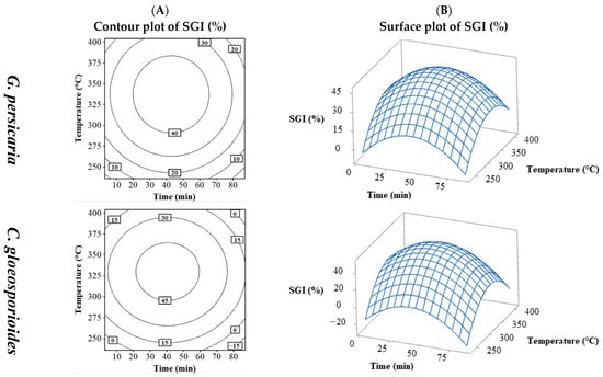 The SGI values (%) varied by pathogen species, with only those for G. persicaria (11.59 to 53.63%) and C. gloeosporioides (4.83 to 62.08%) being adjustable (Table 2). Figure 3 shows the SGI for G. persicaria and C. gloeosporioides with their contour plots (Figure 3A) and surface plots (Figure 3B) of time vs. temperature. The contour and surface plots resulting from the combination of the process variables temperature vs. S/L and S/L vs. time can be found in the Supplementary Material (Figures S14 and S15). Both fungi followed a similar pattern to % MGI, with % SGI maximized near central values of time and temperature and decreasing with further increases. The optimal % SGI was found in the central region, higher for C. gloeosporioides (around 45%) compared to G. persicaria (not exceeding 40%).