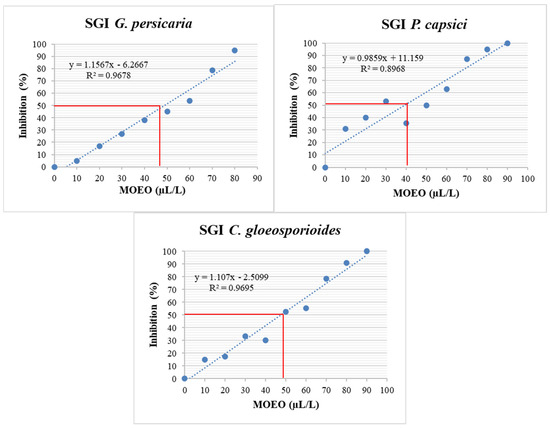 SGI (%) of G. persicaria, P. capsici, and C. gloeosporioides at different concentrations of optimized MOEO. SGI: spore germination inhibition; MOEO: Mexican oregano essential oil. The red line indicates the intersection representing the concentration necessary to inhibit 50% of spore germination. The blue dashed line represents the linear regression fit. The blue dots in the figure indicate the treatments that were performed to obtain the linear regression fit.