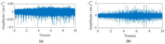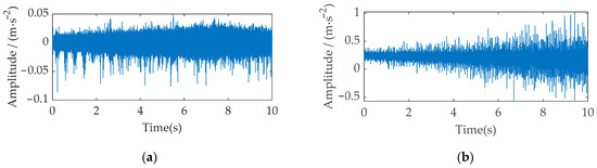 This study selects four types of signals under the condition of acceleration followed by deceleration for analysis and validation. This operational condition, characterized by a curved frequency variation, is more effective in demonstrating the generalization capability of the proposed method. Due to the large volume of data and high sampling rate, directly analyzing the raw signals may lead to memory overload and reduced computational efficiency. Therefore, the signals are subjected to downsampling, yielding a processed sampling frequency of 10 kHz, with a total of 100,000 sample points. The time-domain waveforms for each health condition are presented in Figure 4.
