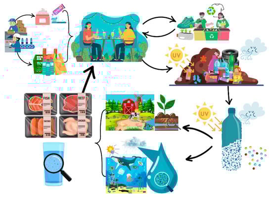 Here begins the microplastic supply chain in human life. For instance, fish consumption introduces varying bioaccumulated doses resulting from the ingestion of primary organisms obtained from rivers and lakes. This is expected to impact not only biodiversity and the availability of fish—whose reproductive rates may decline due to nutrient depletion replaced by consumed plastics—but also potentially pose a risk to human health. Therefore, the study of microplastics, their accumulation, and their potential adverse effects on health must continue to be investigated across various scientific disciplines. Figure 2 shows the traditional life cycle of the plastics in the environment. Microplastic contamination of soil and groundwater is a potential risk for human health, plants, nematodes, soil properties, etc. There are some methods studied for remediation including pyrolysis, replacing plastics with biodegradable materials, plastic filters, etc. [31,32]. However, all these technologies need to be improved.