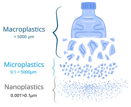 The principal secondary feeding mechanism through which microplastics enter the environment occurs after degradation caused by photodegradation, wind erosion, climate changes, and mechanical processes such as the downstream passage of plastic bags and bottles in rivers. These compounds, in addition to being ingested by small organisms, are very difficult to digest, leading to their accumulation throughout the entire food chain. Consequently, higher plastic concentrations in organisms are associated with more severe adverse health effects. Throughout the 21st century, various studies have demonstrated the presence of microplastics in plankton, fish, and seabirds [33,34]. Figure 3 shows the different types of plastics produced according to the particle size.