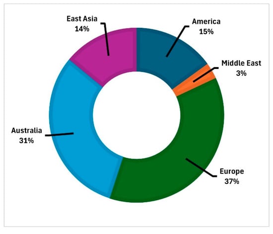 Figure 4 shows a summary of microplastics and their prevalence across continents. Europe records up to 2914 pieces/kg, followed by Australia with 2400 pieces/kg, the Americas with 1190 pieces/kg, East Asia with 1074 pieces/kg, and the Middle East with 205 pieces/kg.