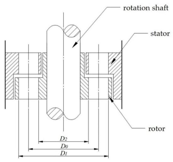 When the impact degree coefficient ma is 0.5, the blades of the stator and rotor are mirror-symmetrical, with , , which results in the highest operational efficiency for the turbine [22]. The basic structural parameters of the designed turbine are listed in Table 1.
