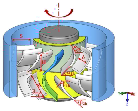 where the axial component of the fluid’s absolute velocity ; circumferential velocity ; contraction coefficient is 0.9; blade pitch ; represents effective flow; and b is the blade’s radial height.