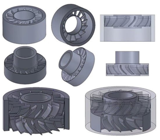 After obtaining the necessary parameters for the single-stage turbine, a basic model was developed using three-dimensional modeling software. The leading and trailing edges of the blades are defined using Bezier curves. The designed three-dimensional model of the single-stage turbine is illustrated in Figure 3.