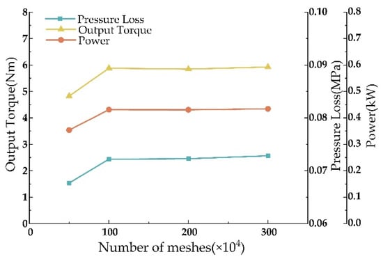 The number of meshes directly impacts the precision of simulation results. Validation under consistent boundary conditions with mesh counts of 500,000; 1,000,000; 2,000,000; and 3,000,000 was conducted to determine the optimal mesh count, assessing pressure drop, torque, and power (Figure 5).