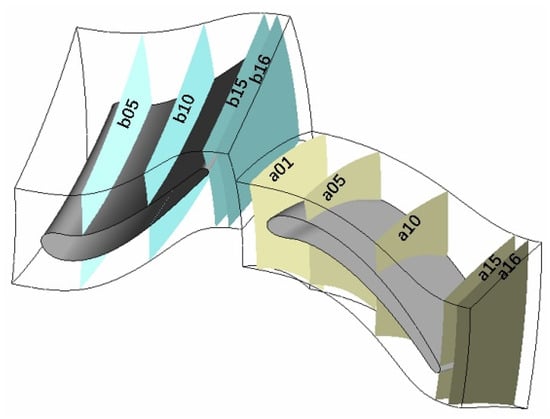 Different cross-sections along the z-axis are chosen to evaluate the impact of blade parameters on the vortex structures within various turbine regions. The rotor is referred to as zone ‘a’, identified by cross-sections a01, a05, a10, a15, and a16; the stator is marked as zone ‘b’, with cross-sections b05, b10, b15, and b16 (Figure 6). Notably, b16 and a01 are situated at the stator outlet and rotor inlet, respectively.