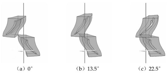 To maximize the turbine’s hydraulic performance, the structural parameters of the blades should be kept within a reasonable range: (1) Drawing on extensive design and manufacturing experience, the optimal range for the leading-edge radius is 0.6–1.0 mm; (2) The ideal trailing-edge radius is between 0.3 and 0.6 mm; (3) Considering the overall length of the tool, turbines with different axial clearances of 2 mm, 4 mm, 6 mm, 8 mm, and 10 mm were designed; (4) This study designed a Φ73 mm turbine with 16 blades, and the staggered angles between the stator and rotor ranged from 0° to 22.5° (Figure 7), with angles of 0°, 4.5°, 9°, 13.5°, 18°, and 22.5° selected to simulate the impact of staggered installation angles on turbine performance.