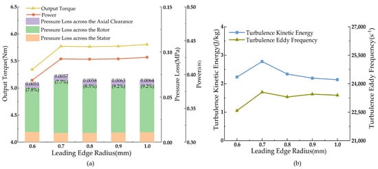 Figure 8a shows that as the leading-edge radius increases, the turbine’s torque, power, and pressure drop rise sharply between 0.6 and 0.7 mm and then stabilize between 0.7 and 1.0 mm, with the pressure drop slightly decreasing thereafter. Figure 8b demonstrates that both turbulence vortex dissipation and turbulence kinetic energy increase initially, then decrease, and stabilize after 0.8 mm.