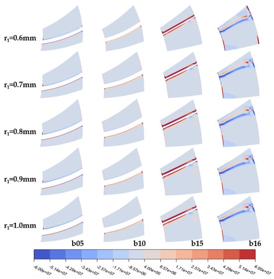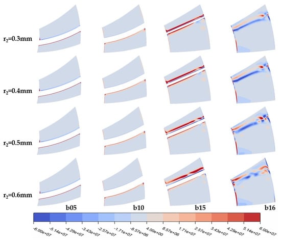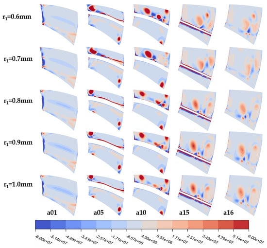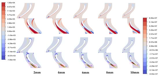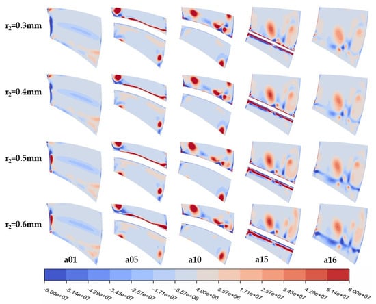 According to the Q-criterion defined in [26], regions with values greater than zero in the cloud diagram are predominantly influenced by vortices, while negative values indicate dominance by strain rates or viscous stresses. Figure 9 reveals that the vorticity distribution on the pressure surface of the turbine rotor remains largely unchanged with variations in the leading-edge radius, while irregular changes occur on the suction side, particularly at 0.7 mm where the vortex-affected area is more concentrated and the vorticity is higher, leading to a less stable internal flow field in the turbine. This instability also explains the fluctuations observed in Figure 7. From 0.8 to 1.0 mm, the vortex groups on the lower part of the rotor blade suction side are smaller and more dispersed, with gradually increasing vortex influence. The increase in the leading-edge radius has minimal impact on the stator’s vortex structure (Figure 10).