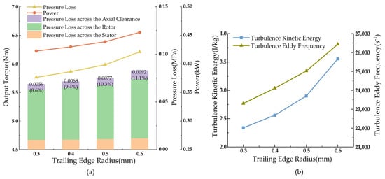 At a trailing-edge radius of 0.4 mm, the pressure drop is 0.0716 MPa, the output power is 0.430 kW, and the output torque is 5.865 Nm. Compared to 0.3 mm, the output performance is better, and compared to 0.5 mm and 0.6 mm, the turbulence vortex dissipation rate is significantly lower, the fluid flow is more stable, and the losses are less.