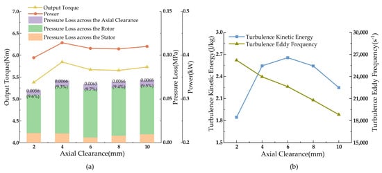 Single-stage turbine performance parameters with changes in axial clearance. (a) Plot of torque, pressure drop, and power versus axial clearance; (b) Curve of turbulent kinetic energy and turbulent eddy frequency versus axial clearance.