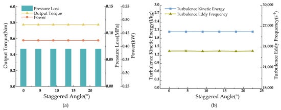 As shown in Figure 16, simulation results indicate that changes in staggered angles result in minimal variations in the turbine’s output pressure drop, torque, and power, with the turbine’s output performance remaining essentially stable within a cycle. The impact of different installation-staggered angles on turbine performance is negligible.
