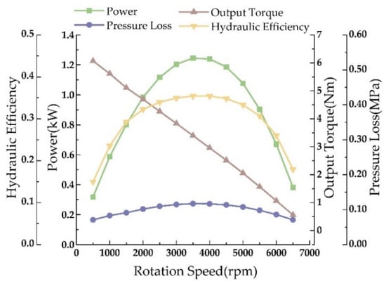 Initially, the output performance curve of the φ73 mm single-stage turbine was validated (Figure 17) to assess its rationality. This curve, representing water as the fluid medium at a flow rate of 30 L/s, illustrates a clear linear relationship between the turbine’s output torque and rotational speed, with torque decreasing as speed increases. The designed single-stage turbine achieves a braking torque of 6.5 Nm; the power increases initially then decreases with rising speed, peaking at 1.17 kW at 3500 rpm; hydraulic efficiency follows a similar trend; pressure drop changes minimally with speed. The turbine performance prediction curve simulation aligns with the theoretical characteristics of turbine drilling tools, validating the turbine’s design.