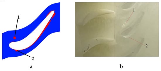 In addition to this, the paper refers to the study of Gong et al. [31]. According to the modeling parameters in [31], the same model is established, and the simulation method used in this study is applied to set the same boundary conditions to simulate the vortex structure in the second-stage turbine stator at an inlet attack angle of 0° and a rotational speed of 3000 rpm, and the results are compared with the experiments in the references, as shown in Figure 18. Based on the results of the comparison, it can be seen that the output of the vortex structure cloud diagrams of the simulation method used in this paper is similar to that of the vortex structure observed in the experiments. Thus, the simulation method used in this paper is feasible and the simulation results are reliable.