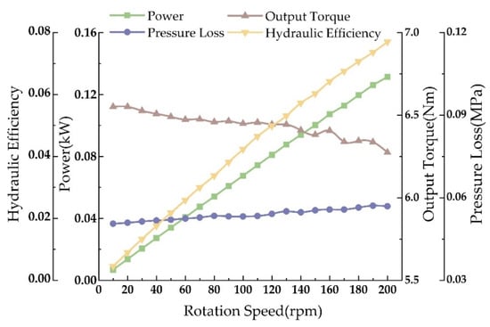 To determine the turbine’s output performance at low speeds, simulations were performed from 0 to 200 rpm, with results shown in Figure 19. At low speeds, the turbine’s power and hydraulic efficiency, compared to pressure drop and torque, are significantly more affected by speed, showing a linear increase. The pressure drop remains almost unchanged, under 0.04 MPa; torque slightly decreases with increasing speed, reaching over 6.3 Nm; power achieves up to 0.1 kW.