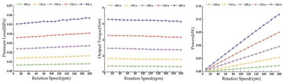 Simulations were conducted for single-stage turbines at flow rates ranging from 10 to 30 L/s, with results depicted in Figure 20. With increasing displacement, the power, torque, and pressure drop of the turbine all increase at a given speed, with a progressively larger increment. Under conditions approximating actual operational low speeds and small displacements, the single-stage turbine’s pressure drop is controlled below 0.007 MPa, torque exceeds 0.8 Nm, and power reaches 0.01 kW.