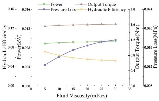 At a drilling site, drilling fluid viscosity varies. Simulations for fluid viscosities ranging from 5 to 30 mPa·s were conducted at a flow rate of 10 L/s and a speed of 80 rpm (Figure 21). The results demonstrate that the turbine’s torque, power, and pressure drop all increase with rising fluid viscosity. The effect on pressure drop is particularly significant, with increased viscosity substantially raising the turbine’s pressure losses, thereby reducing its operational efficiency. Under these conditions, the single-stage turbine’s output torque can reach up to 1.6 Nm.