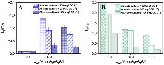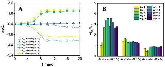 (A) The electroactivity of bioelectrodes cultured in RPBC at different electrode potentials (−0.4 V, −0.3 V, and −0.2 V) in 50 mM PBS containing 1500 mg COD L−1 acetate; (B) the −Ire/Iox of the electroactivity of bioelectrodes cultured in RPBC at different electrode potentials (−0.4 V, −0.3 V, and −0.2 V) in 50 mM PBS containing 1500 mg COD L−1 acetate.