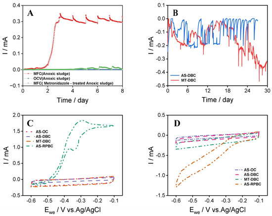 (A) The current output of an MFC cultured with anoxic sludge, open circuit condition (OCV), and metronidazole-treated anoxic sludge; (B) the current output of AS-DBC and MT-DBC biocathodes operated at a constant potential of −0.4 V; (C) the CV of the AS-OC, the AS-DBC, the MT-DBC, and the AS-RPBC recorded in nitrite solutions at a scan rate of 2 mV s−1; (D) the CV of the AS-OC, the AS-DBC, the MT-DBC, and the AS-RPBC recorded in acetate solutions at a scan rate of 2 mV s−1.