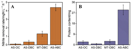 (A) The nitrite removal rate of the AS-OC, the AS-DBC, the MT-DBC, and the AS-RPBC in 12 h; (B) the protein content of the electrode biofilm of the AS-OC, the AS-DBC, the MT-DBC, and the AS-RPBC.
