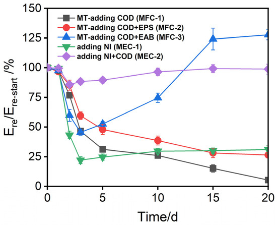 The factors affecting the growth and maintenance of reducing EAB on the electrodes were analyzed by operating the stable biocathodes cultured in RPBC under different conditions, and using metronidazole to selectively remove the electrogenic bacteria on the biocathodes. After metronidazole treatment, the nitrite-reducing electroactivity of the bioelectrodes (MFC-1 and MFC-2) under both solution conditions (acetate solution with and without added EPS) did not change immediately but gradually decreased with the operational time and finally stabilized at 26% and 5% of that before metronidazole treatment, respectively (Figure 6). And after 20 days of operation, the biofilm thickness of the two bioelectrodes decreased by 25.10 μm and 27.42 μm, making them 30.1% and 34.1% lower than before treatment. The viability of the microorganisms on the two bioelectrodes decreased by 45.8% and 35.8%, respectively (Figure 7). The delayed reduction in electroactivity after metronidazole treatment indicated that metronidazole did not directly inhibit the activity of nitrite-reducing EAB but indirectly affected the growth of nitrite-reducing EAB by removing electrogenic bacteria. In addition, this gradual decrease in reducing electroactivity, rather than an immediate drop, suggested the possible existence of alternative electron transfer pathways in biofilms cultured in RPBC. These pathways, which were not immediately interrupted by the death of the electrogenic bacteria, might involve extracellular electron transfer mechanisms such as conductive nanowires and redox-active mediators.