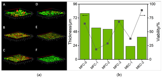 (a) Confocal laser scanning imaging of bioelectrodes of MFC-0 (A), MFC-1 (B), MFC-2 (C), MFC-3 (D), MEC-1 (E), and MEC-2 (F); (b) the thicknesses (corresponding to the left ordinate) and viabilities (corresponding to the right ordinate) of different bioelectrodes.