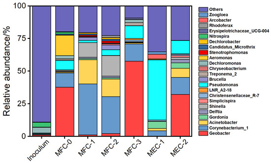 The relative abundance of the microbial community in the inoculum and the bioelectrodes of MFC-0, MFC-1, MFC-2, MFC-3, MEC-1, and MEC-2 at the genus level.