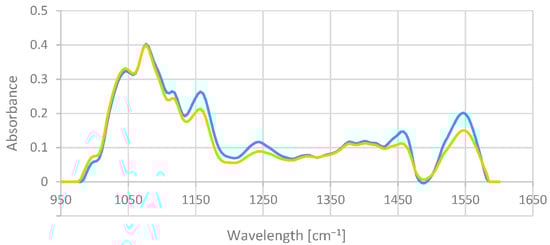 Based on Figure 4, it can be concluded that a key signature for distinguishing sheep’s milk from cow’s milk may be the spectroscopic bands primarily located around the so-called characteristic wavelengths for amide I and II, specifically at 1454 nm and 1550 nm [19].