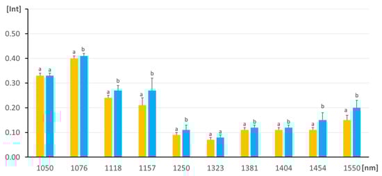 For the obtained results, mean values and standard deviations were calculated. From the graphs of mean values for the tested milk types, characteristic wavelengths were identified where an increase in intensity was observed (Figure 2).