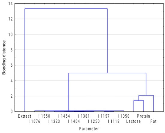 Positive PC1 values describe only the Lactose parameter, while negative PC1 values describe the remaining parameters. A strong negative correlation was observed between Lactose and the other parameters. Meanwhile, the parameters Fat, Protein, Extract, I 1050, I 1076, I 1118, I 1157, I 1250, I 1323, I 1381, I 1404, I 1454, and I 1550 are positively correlated with each other.