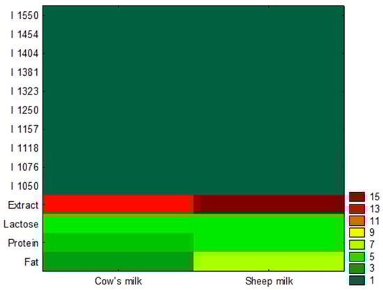 The most notable differences were observed in the Fat, Protein, and Extract parameters, with higher values recorded for sheep’s milk. No differences were found for lactose or intensity at characteristic wavelengths.