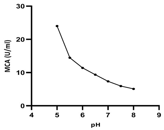 The effect of pH on the milk-clotting activity (MCA) of CGLE was tested at 30 °C in the pH range of 5.0–8.0 at an interval of 0.5. The pH solution was adjusted with either 0.1 N HCl or 0.1 N NaOH. The pH was measured with a pH meter (Phoenix, EC-45 pH, Mannheim, Germany), which was previously calibrated using buffer solutions at pH 4 and pH 7.