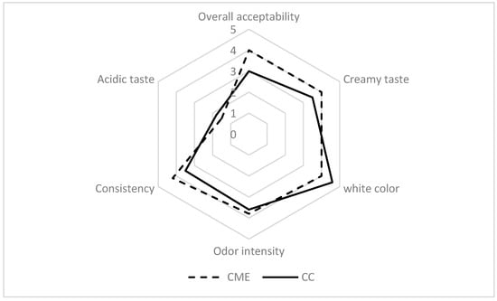 The sensory evaluation of the CME and CC samples was achieved by 25 trained panelists (panelists were formed for every descriptive vocabulary of the basic sensory modalities, that is, appearance and texture, odor, and taste). Cheese samples were assessed for their white color, odor intensity, creamy taste, consistency, bitter taste, and overall acceptability using a six-point scale, ranging from 0 (low intensity) to 5 (high intensity) (ISO 13299, 2016) [].
