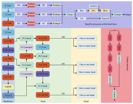 The neck section processes the backbone output further for multi-scale feature fusion. It performs up-sampling on the backbone output and concatenates the resulting feature map with the one obtained in step 6 of the feature extraction process. The obtained feature map undergoes further extraction using the C3TR module. Next, up-sampling is performed, followed by splicing with the feature map from step 4. After fusion by the C3TR module, the result is output to the head layer. Convolution is then applied to integrate the feature map, which is spliced with the intermediate feature map obtained in step 13. The C3TR module performs additional feature extraction, and the results are passed to the head for object detection. To maintain consistency with the feature map in step 10, down-sampling is applied for feature splicing, followed by further processing with the C3TR module before outputting to the head layer for target detection. The head layer receives feature maps from different network depths, which have been processed by the feature pyramid. These feature maps undergo further processing through convolutional layers and are then stitched together to produce the final feature map. The final detection result is achieved through classification and candidate box branching. In the detection layer, two detection heads are used during the training process, but only one detection head is used during inference. In the head detection process, the anchor scores are first sorted, and the top 300 anchors are selected. For each class, the candidate boxes are further sorted to retain those with the highest scores. During training, this process replaces the original NMS (Non-Maximum Suppression). The classification loss function during training is Binary Cross-Entropy Loss, which can be expressed mathematically as