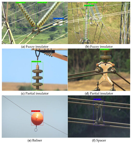 As shown in Figure 7, our method detects the results of electrical equipment images after training. Figure 7a displays the detection results for insulator images. It is evident that the recognition accuracy remains high even for fuzzy insulators. Notably, the small fuzzy Stockbridge object in the lower right part of the image is also recognized accurately. The ability to accurately identify the insulator image despite the presence of an object occlusion can be seen in Figure 7b, which demonstrates the ability of our network to accurately correspond to the features based on some of the objects to identify to the object. Some of the insulator images are shown in Figure 7c,d. Our network can accurately and efficiently identify the corresponding object from its part, as shown in the figure with the recognized insulator image. Figure 7e shows the recognition baliser, which can accurately identify small target objects. Figure 7f illustrates the accurate recognition results for spacer images, and it is worth mentioning that the recognition accuracy is up to 100% for the spacer class among 1132 mixed-category images during the network validation test in Table 2.