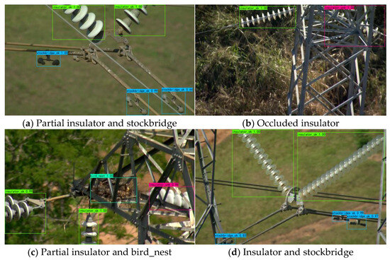 Figure 8 shows the effects of multiple targets and complex backgrounds on target recognition. As shown in Figure 8a, the image contains a partial insulator and three stockbridge target objects, all of which can be accurately recognized, further verifying the ability of our network to accurately determine the object class based on part of the object, as well as its effectiveness in recognizing objects with small targets and achieving a high accuracy rate for small targets as well. One occluded insulator and one un-occluded insulator are shown in Figure 8b, showing accurate identification of the un-occluded insulator. Our network can still accurately detect the occluded insulator based on the exposed part, regardless of the occluding tower. In Figure 8c, the image shows three insulators and a bird’s nest, where two insulators are only partially visible, and one is obscured by a pole tower, also only partially exposed. It is noteworthy to accurately detect the obscured insulators and only partially exposed. Figure 8d shows two insulators and three small target objects, specifically stockbridge devices, one of which is partially exposed. The ability to efficiently and accurately detect the categories to which the various objects in the figure belong demonstrates the detection capability of our network.
