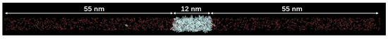 Figure 1 illustrates the model used to simulate the mixing of decane and CO2 molecules. A simulation box of 4 nm × 4 nm × 122 nm is set, in which 500 decane molecules are inserted as an oil block which is enclosed by 2000 CO2 molecules on each side. Due to the periodic boundary conditions used along all directions, the system is infinite in the xy plane (parallel to the decane and CO2 interface). The large size of 122 nm along the z direction is because the gaseous state of the CO2 molecules, which takes significantly more space compared to the oil phase. The model as shown in Figure 1 represents a binary system with just decane and CO2, while for simulations with MMP reducers, the reducer molecules are added into the CO2 phase as the initial configuration. The model system is then subjected to an NPT run, controlled by the Parinello–Rahman barostat, during which the box size changes along the z direction while the x and y dimensions are kept constant depending on the pressure.