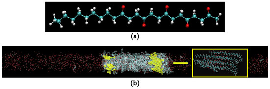 (a) Structure of an MMP reducer with 5 ketone groups, (b) snapshot of the model system containing 50 of the MMP reducers by the end of 20 ns. The MMP reducers are shown in yellow to better demonstrate their configuration and location.