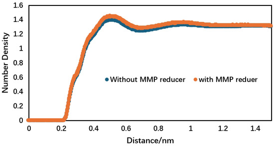 This can be confirmed from the simulation trajectory as well; above 16 MPa, all the oil molecules are separated by CO2 molecules and no micro-clusters exist. It is therefore an even mixing between molecules of different types. This will hereafter be referred to as the true-miscible stage, whereas the region with a medium slope (from 12 MPa to 16 MPa) is the near-miscible stage. During the near-miscible stage, the micro-clusters of oil molecules gradually become invaded and broken by CO2 molecules that are essentially being squeezed into the oil clusters due to increasing pressure. This can be demonstrated by the rdf analysis of decane molecules during the simulation. Figure 13 shows the first peak of each individual decane rdf curves at different pressures in the absence and presence of the MMP reducer. As can be seen from Figure 13a,b, regardless of the presence of MMP reducers, with the increase in the pressure, the distribution of decane molecules experience a drastic change until 12 MPa, after which the changes are no longer significant. To better illustrate the change pattern, the peak values are plotted against the pressures and are shown in Figure 14, from which three stages can be identified. From 8 MPa to 12 MPa, the decrease in decane molecules around themselves exhibits a fast decline, indicating the breakage of the continuous oil phase into small aggregates (clusters). Between 12 MPa and 16 MPa, the decrease in the peak value experiences a mild drop, signifying the further collapsing of the oil clusters. And after 16 MPa, no significant change in the number density peak value can be observed, hinting that all decane molecules are at stable distribution regardless of the additional pressure.