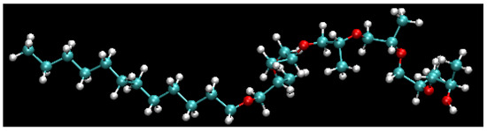 In light of the above deduction, a series of MMP reducers with C10 carbon chains and ketone, ether, ester, and alcohol functional groups are constructed and tested in subsequent MD runs (Figure 4). Especially considering the outstanding ability of ketone groups in attracting CO2 shown in Figure 3, a molecule with five ketone oxygens is built to investigate the impact of ketone group in MMP reduction (Figure 5a). However, during the trial runs, this molecular structure does not exhibit such potentials, as they aggregate into blocks where the molecules are apparently aligned and stay at the CO2-decane interface without dispersing further into the oil phase (Figure 5). Consequently, no enhanced mixing of CO2 is obtained as can be proved in the overlapping RDF curves of CO2 around decane molecules in the presence and absence of the MMP reducer (Figure 6). The reason could be the strong intermolecular interaction between ketone oxygens and ketone carbons which leads to the exceedingly strong conglomeration of these molecules. Similar structures with ether, ester, and alcohol functional groups are no longer investigated in this work; instead, an MMP reducer (C12PO6) structure that is reported to be efficient in MMP reduction in a laboratory study [46] (Figure 7) is chosen together with the structures shown in Figure 4 in subsequent simulations.