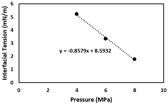 Using Equation (1), the interfacial tensions between CO2 and the oil phase are calculated for systems in the presence and absence of various MMP reduces. An example is shown in Figure 8 for the binary system with just decane and CO2, where the interfacial tension decreases with increasing pressure, and the trend is linearly extrapolated to obtain the X-axis intercept of 10.01 MPa. The value is then considered the MMP for this system at 333 K. Ma [46] reported an MMP of 8.93 MPa at 323 K, and an MMP of 12.15 MPa at 344 K for the decane and CO2 system. Therefore, our result of 10.01 MPa at 333 K is reasonable and falls in line with the literature.