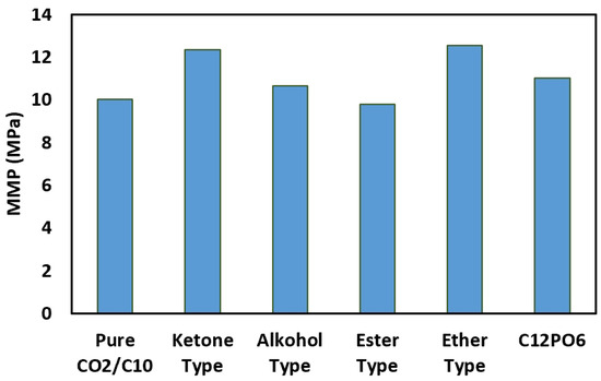 MMP values obtained using the IFT approach for systems without the MMP reducer and ketone-type, alcohol-type, ester-type, and ether-type reducers with C10 chain length, and C12PO6 MMP reducer.