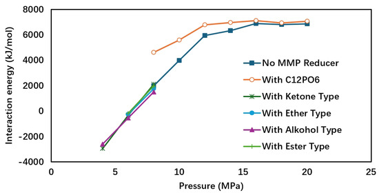 The MMP reducer from the literature, C12PO6 [46], is used in this section to investigate the molecular scale boundary between miscibility and near miscibility. The interaction energies between the oil molecules are calculated for systems with and without MMP reducers, and the results are plotted in Figure 12. The interaction energy referred to in this manuscript is the sum of LJ (Lennard–Jones) and Coulombic energies. While the LJ energies are negative, indicating attraction between components, the coulombic energies are increasingly positive at higher pressures when the molecules are pressed closer to each other. This renders the transition of the interaction energies from negative to positive values, which is in line with an MD study by Zhang et al. [35]. As can be seen, curves for the system without any MMP reducers and the one with C12PO6 follow the same pattern. The interaction energy between the molecules first increases linearly with the increase in pressure. Then, the curves experience a decrease in the slope and further increase with the pressure, also in a linear manner before they eventually stabilize at relatively close values at approximately 7000 kJ/mol beyond 16 MPa. The physical meaning for the leveled-off stage is that the tendency of decane molecules to repel each other no longer increases with additional increases in pressure. In other words, the mixing of the decane and CO2 molecules reaches an equilibrated state regardless of the pressure. This falls in line with the definition of miscibility. Additional interaction energies are calculated for different types of MMP reducers constructed as shown in Figure 4, and the results are included in Figure 12. The results indicate that in terms of the interaction energy, the interaction energies in the presence of all constructed MMP reducers (other than C12PO6) are similar to that of a pure oil/CO2 system. In other words, they do not effectively reduce the MMP. This is possibly due to there being only one O-containing functional group in their molecular structures, which provides minimal attraction to CO2 molecules. It needs to be noted that although the IFT-based estimation method can to some extent predict MMP values from a recovery perspective, it can become invalid when a clearly defined interface region disappears, especially when cross-boundary components such as surfactants are distributed throughout the system. Alternatively, the interaction energy-based method does not yield results that match experimental values but rather reveals the true-miscibility range from a physical perspective, which, as will be demonstrated in a later section, can be used to compare the relative effectiveness in MMP reduction.