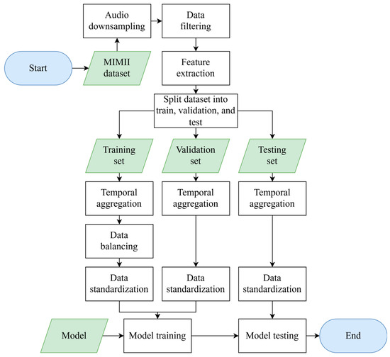In this study, we undertook a series of data preparation steps, as illustrated in Figure 2. First, the original audio data were downsampled from 16 kHz to 8 kHz to reduce computational costs. Then, we addressed the issue of class imbalance. Since each machine type had fewer abnormal samples than normal samples, we randomly selected an equal number of normal samples to match the abnormal ones for each machine, then merged them to form a new dataset. This ensured that each machine had the same number of normal and abnormal samples, effectively mitigating class bias. Consequently, we obtained four types of machines, each with normal and abnormal states, resulting in a total of eight categories of data.